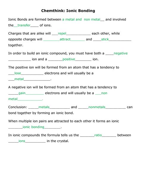 Read Chemthink Ionic Bonding Answers Epub By Click Button. Chemthink Ionic Bonding Answers it’s easy to recommend a new book category such as Novel, journal, comic, magazin, ect. You see it and you just know that the designer is also an author and understands the challenges involved with having a good book. You can easy klick for detailing book and you can read it online, even you can download it